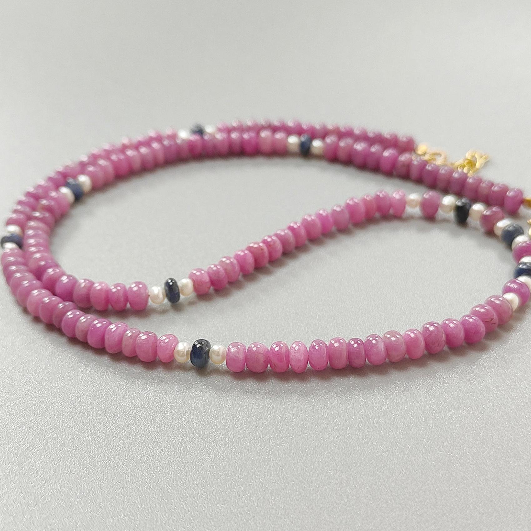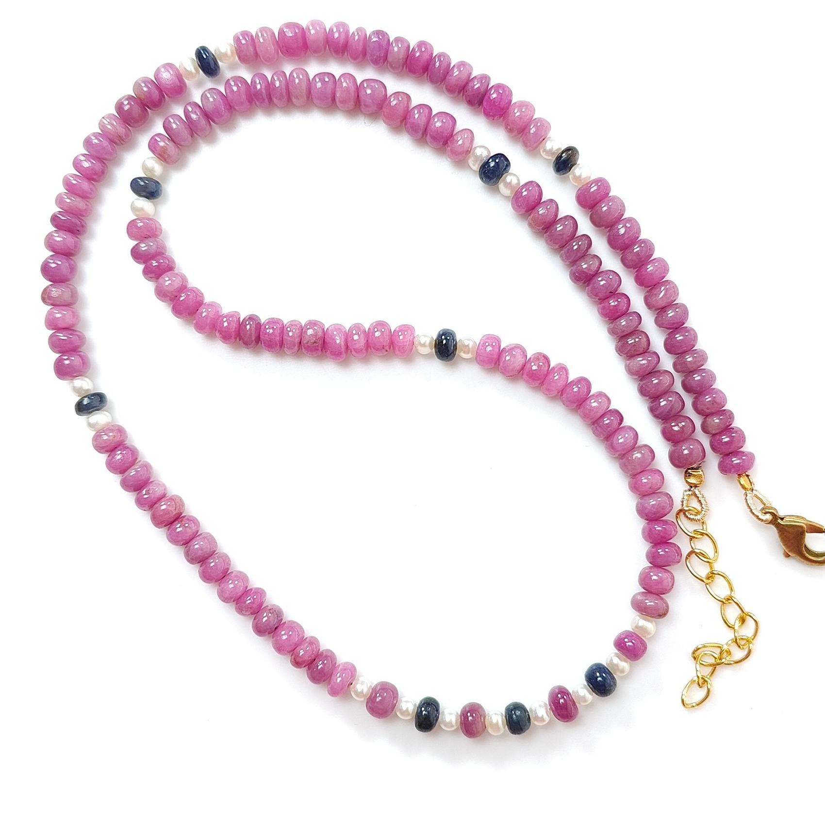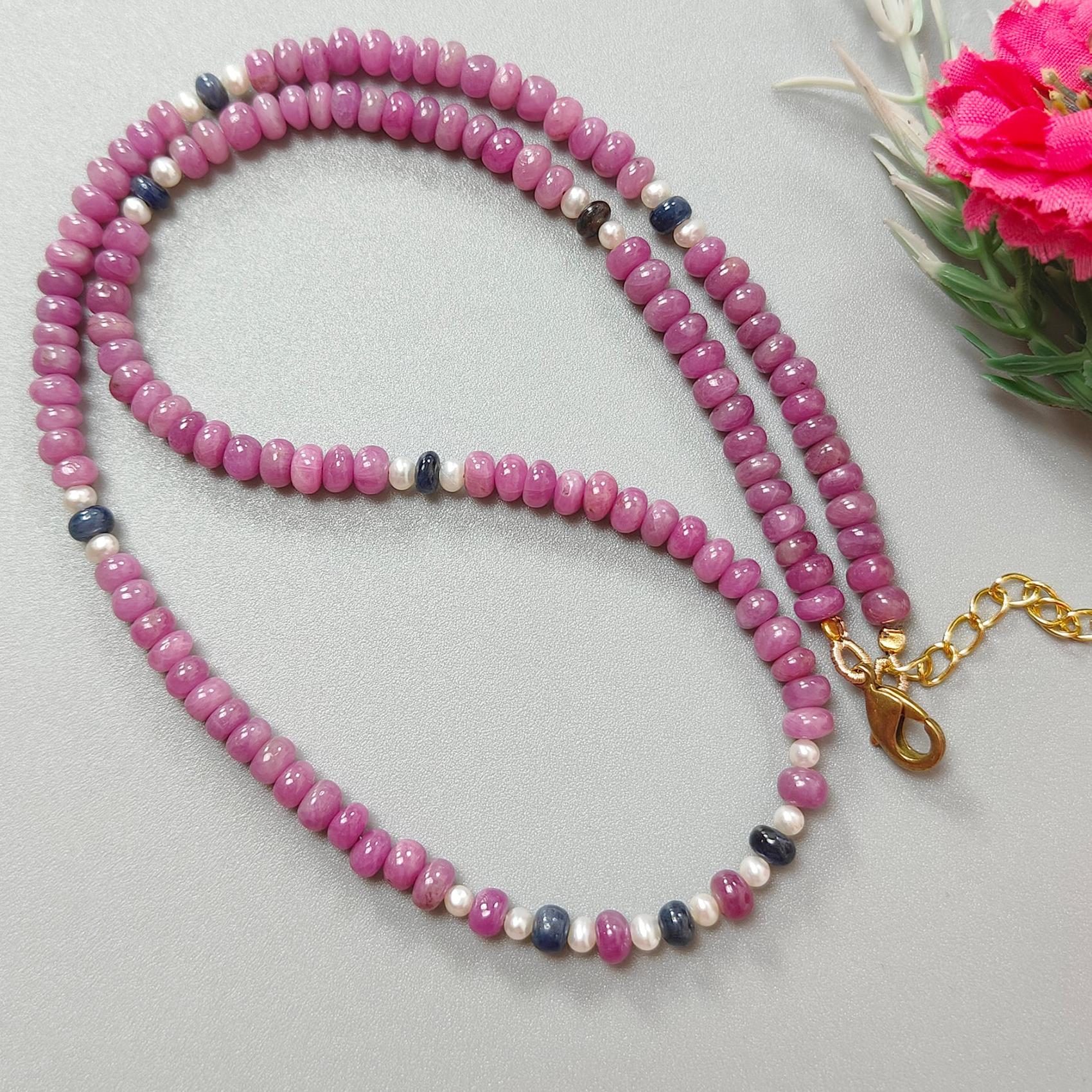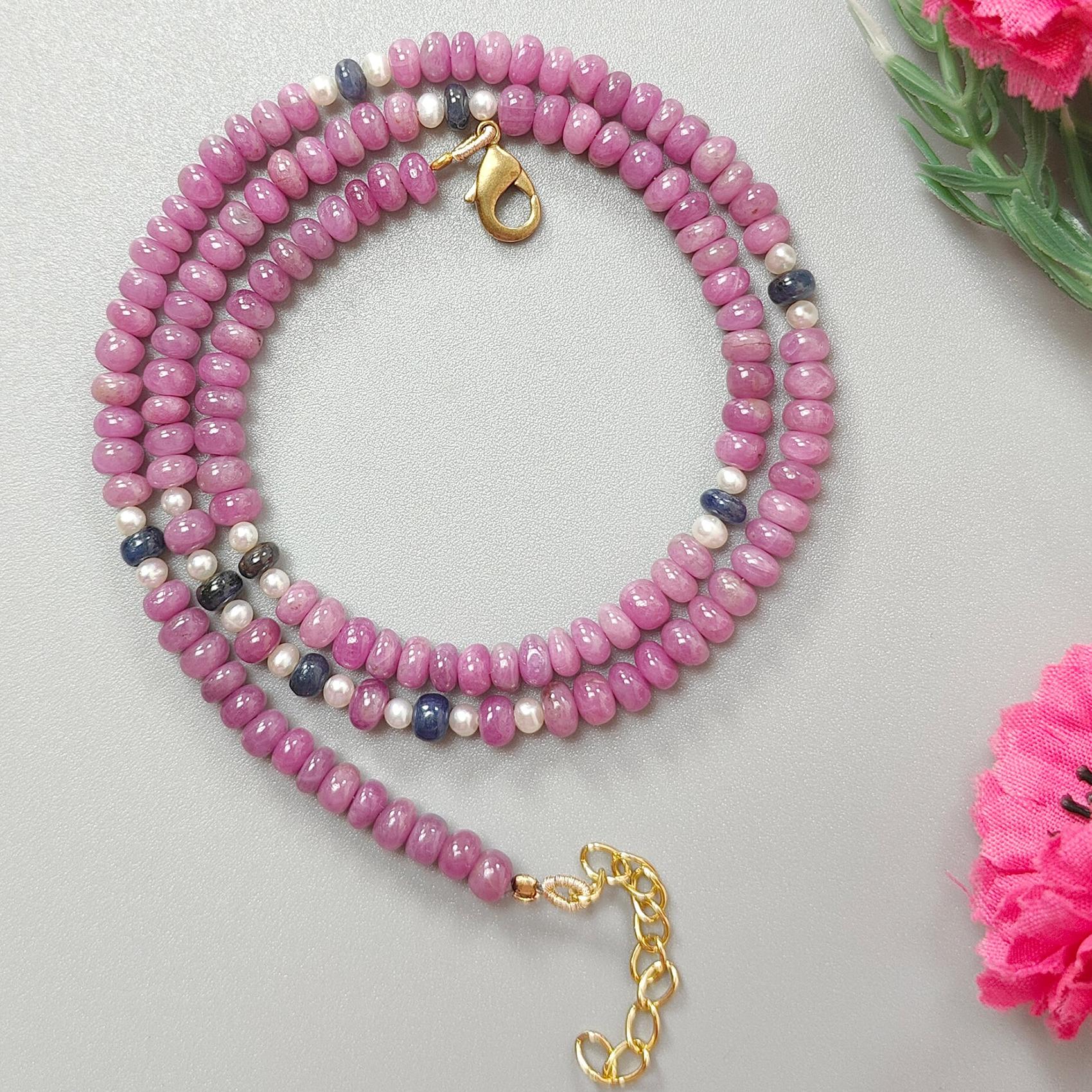 Pink Sapphire Gemstone Beads Necklace: 22.83gms Natural Ruby Pearl & Blue Sapphire Plain Rondelle Brass Necklace 4.5mm - 5mm 18"