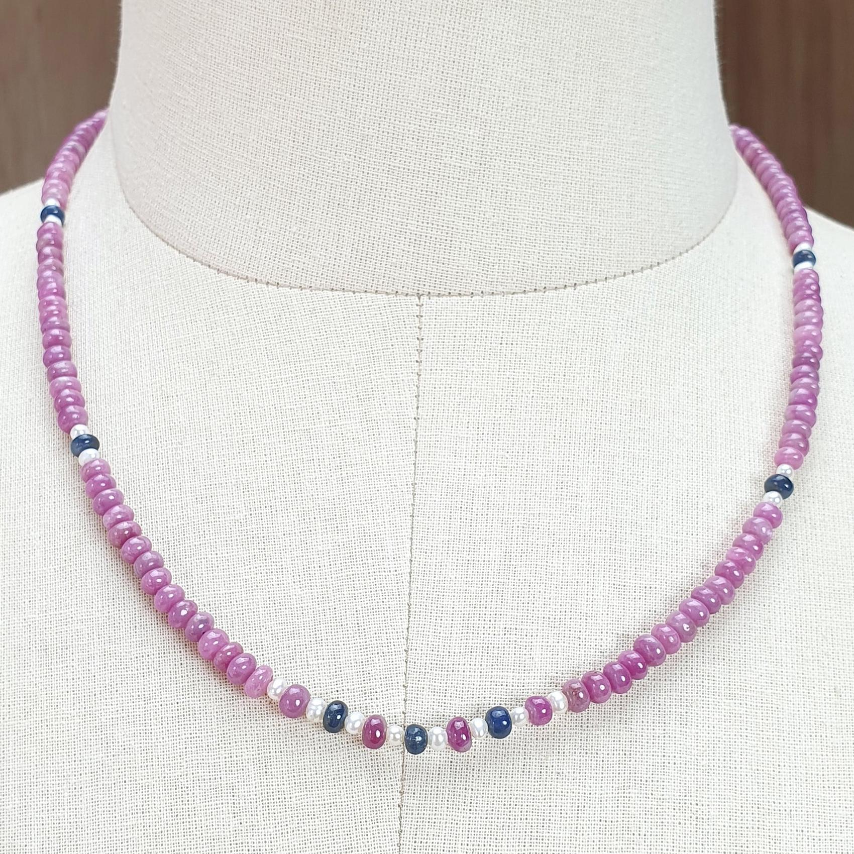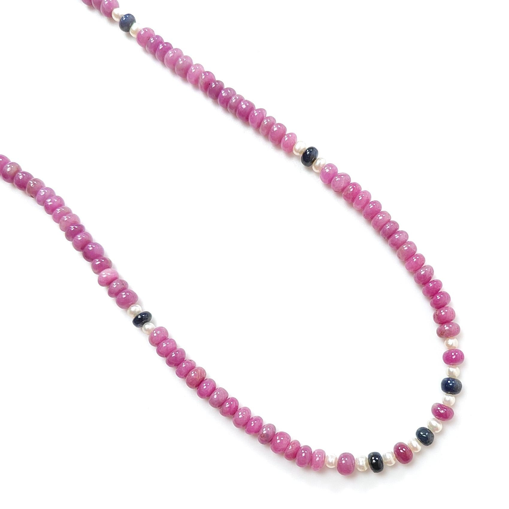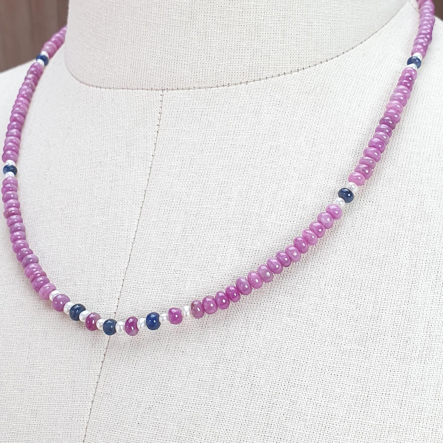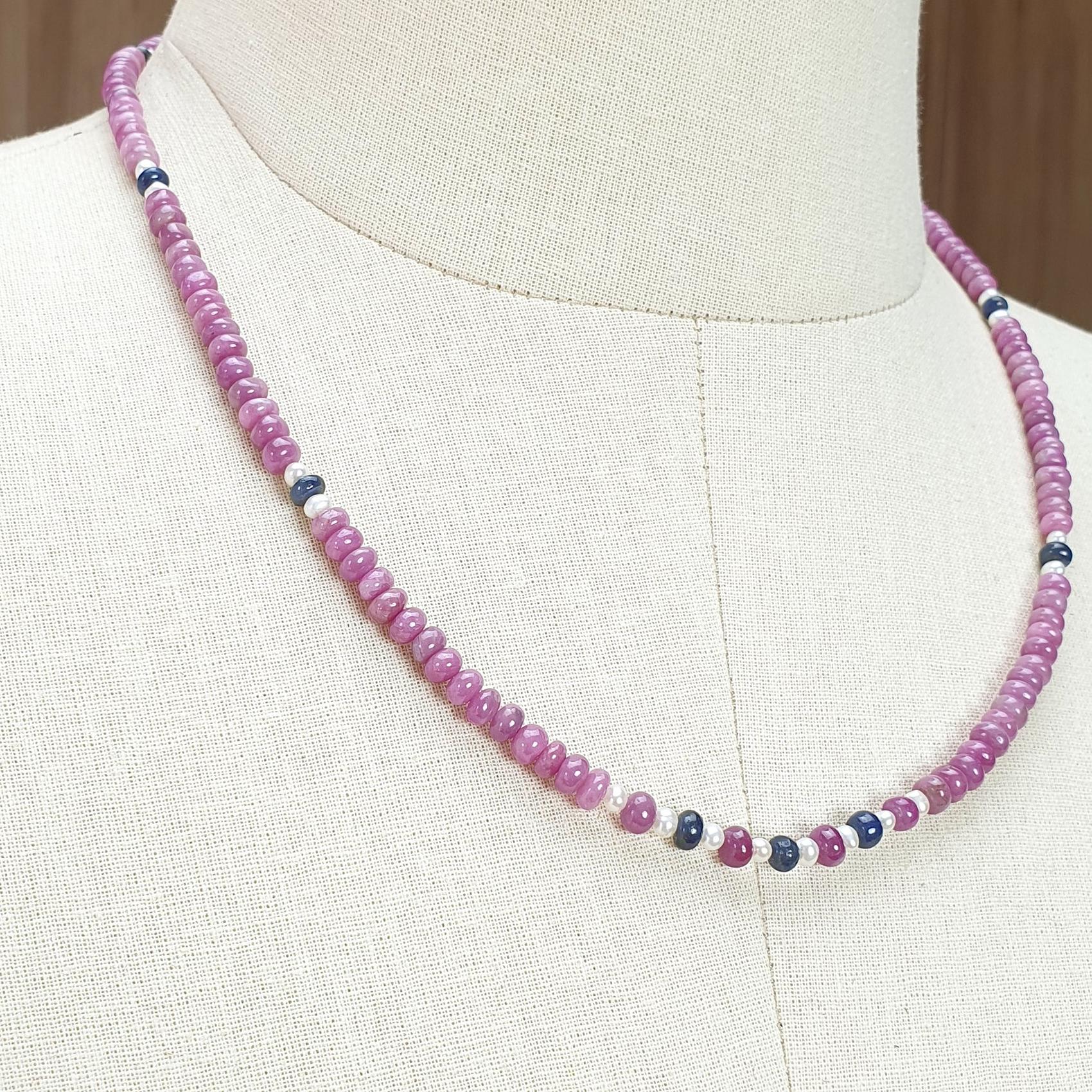 Pink Sapphire Gemstone Beads Necklace: 22.83gms Natural Ruby Pearl & Blue Sapphire Plain Rondelle Brass Necklace 4.5mm - 5mm 18"