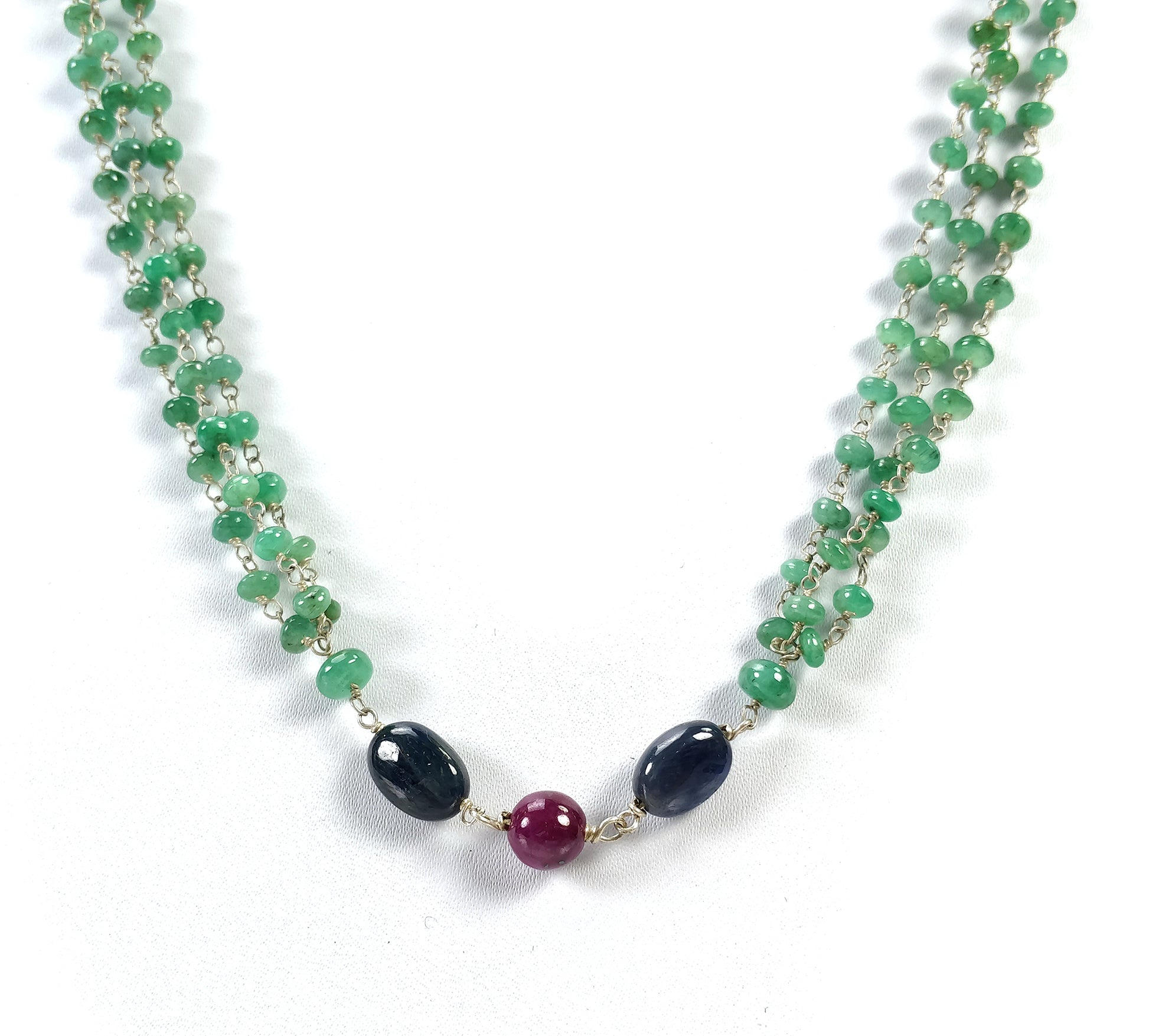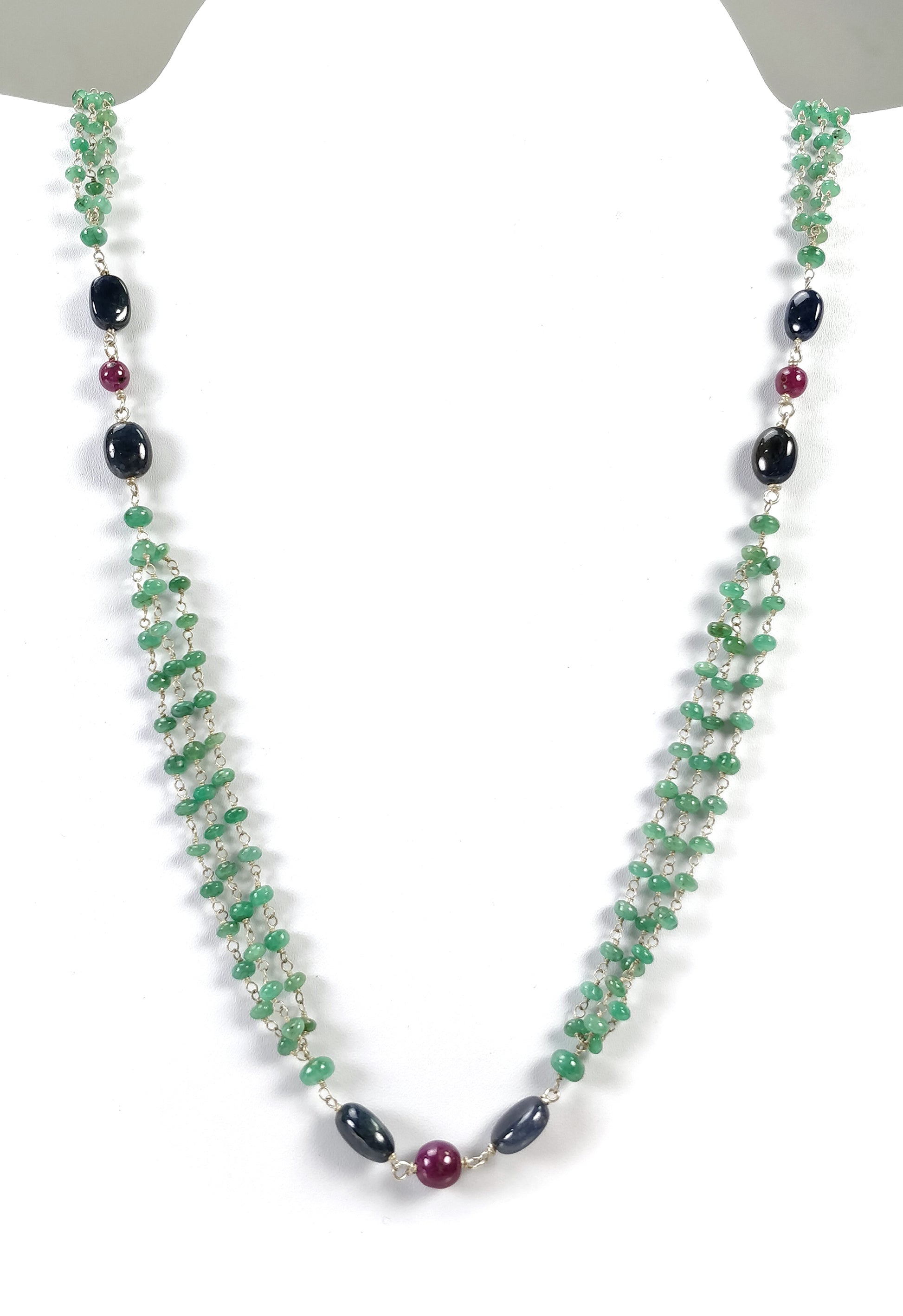Green EMERALD & Sapphire Ruby Gemstones Beads Chain NECKLACE : 925 Sterling Silver Natural Emerald Cabochon 31" Statement Necklace