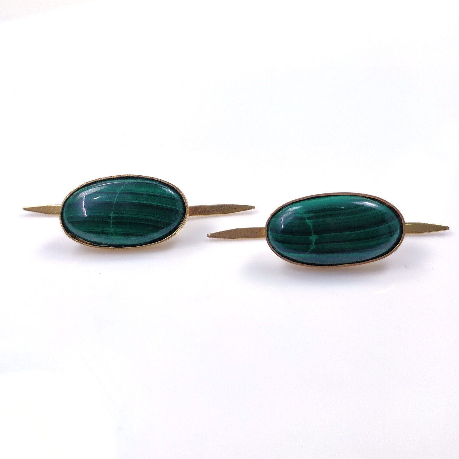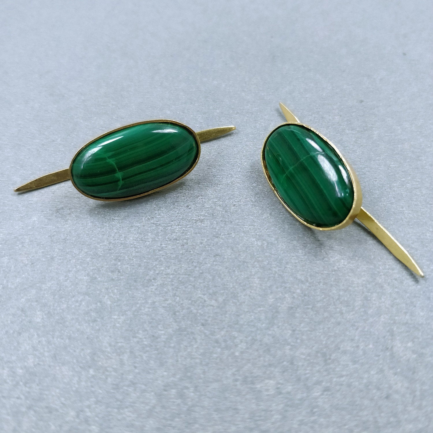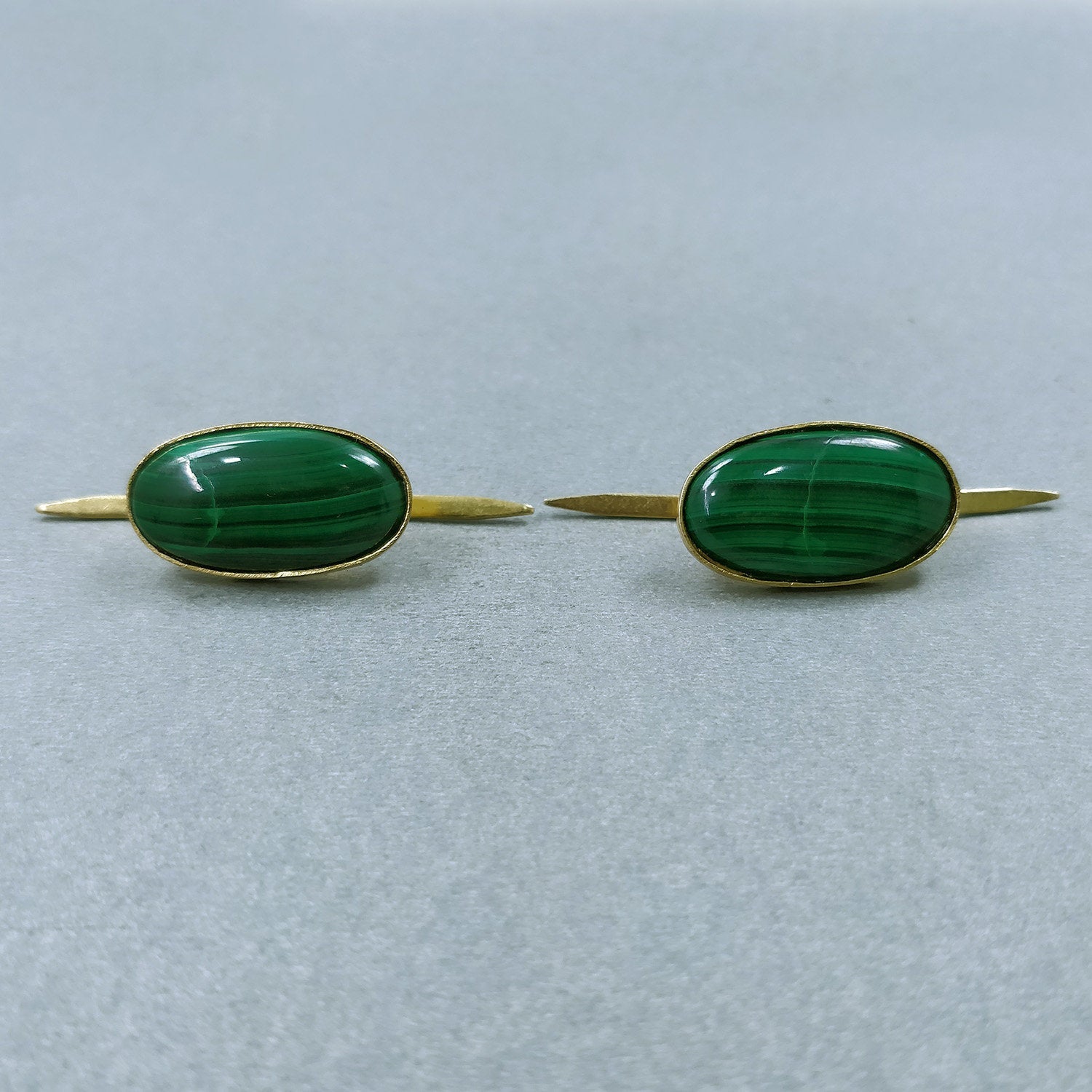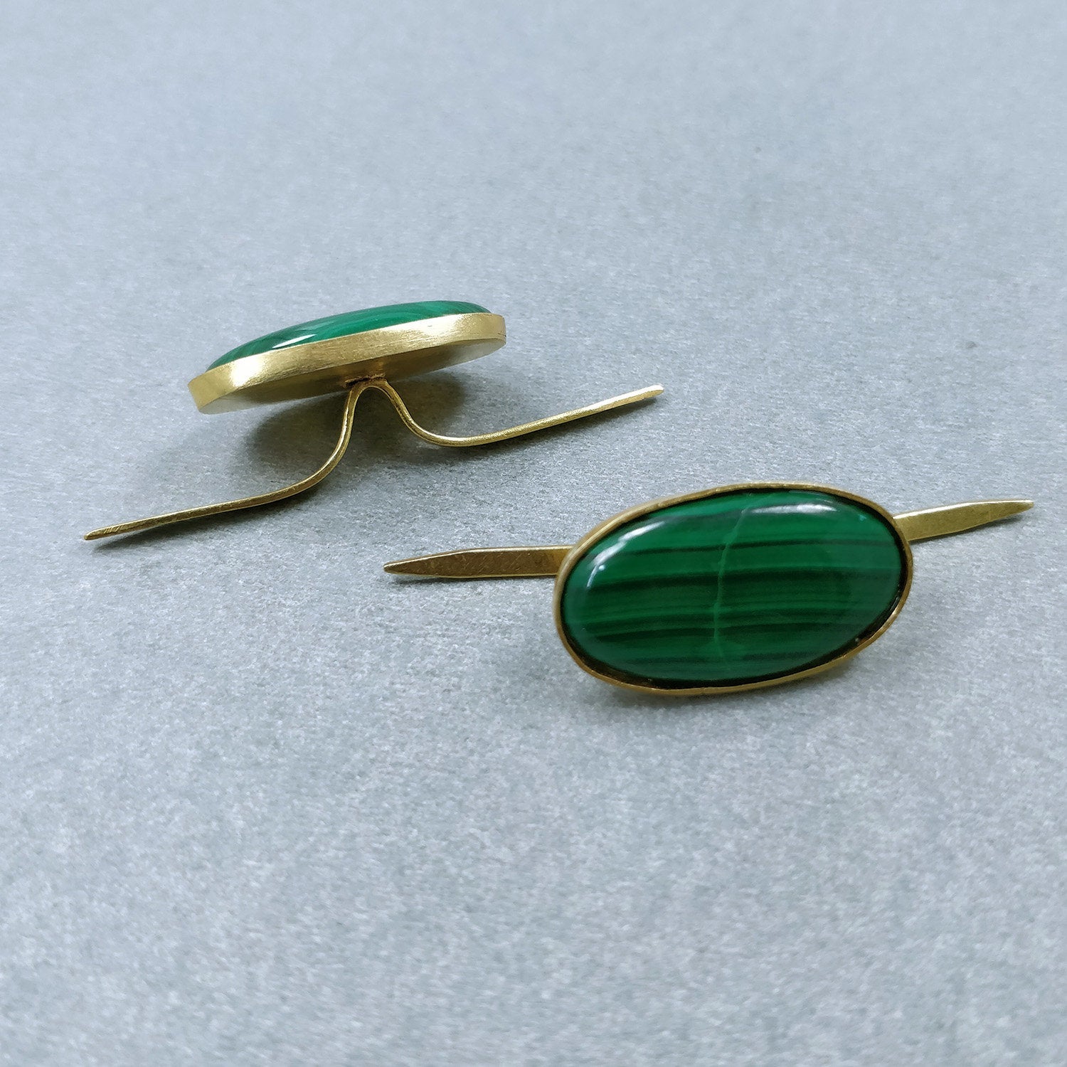 GREEN MALACHITE Gemstone PIN : 9.60gms Natural Untreated Malachite Gemstone Oval Cabochon Brass Gold Plated Lapel Pins 25*13.5mm*5(h) Pair