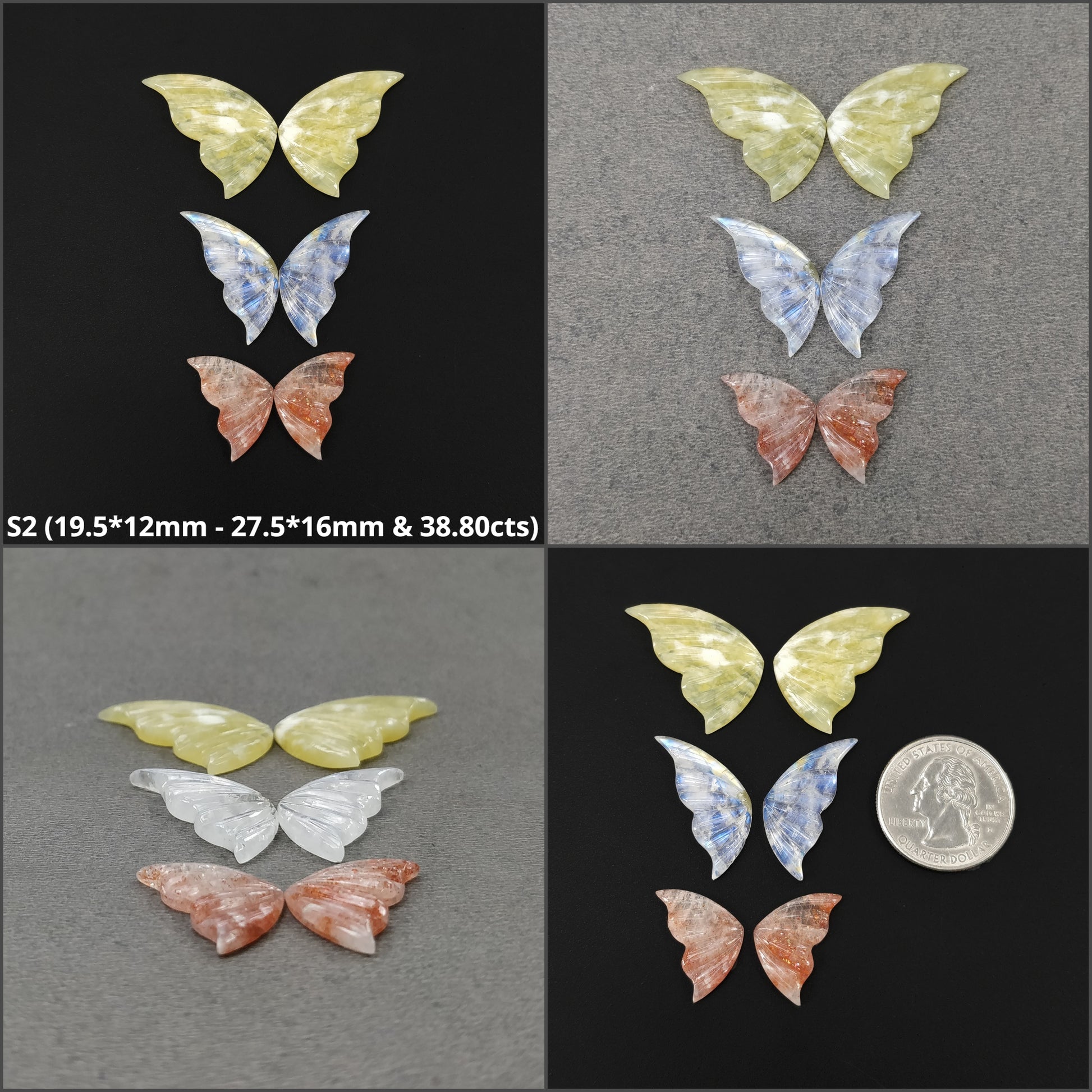 Opal Sunstone & Rainbow Moonstone Gemstone Carving : Natural Untreated Unheated Hand Carved Butterfly 3 Pair Set