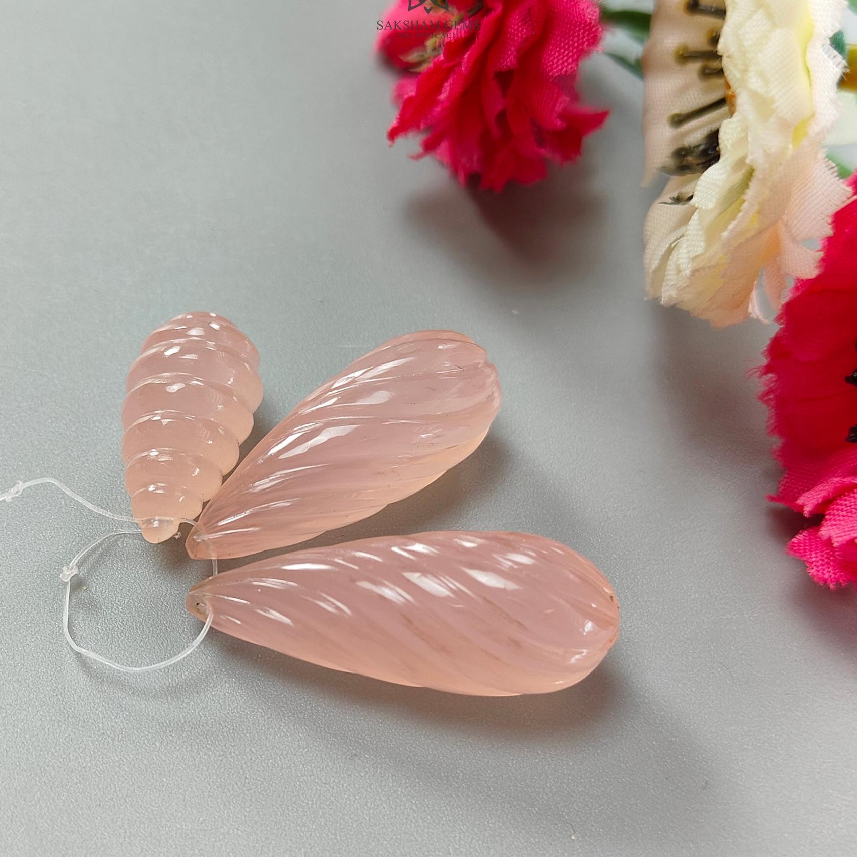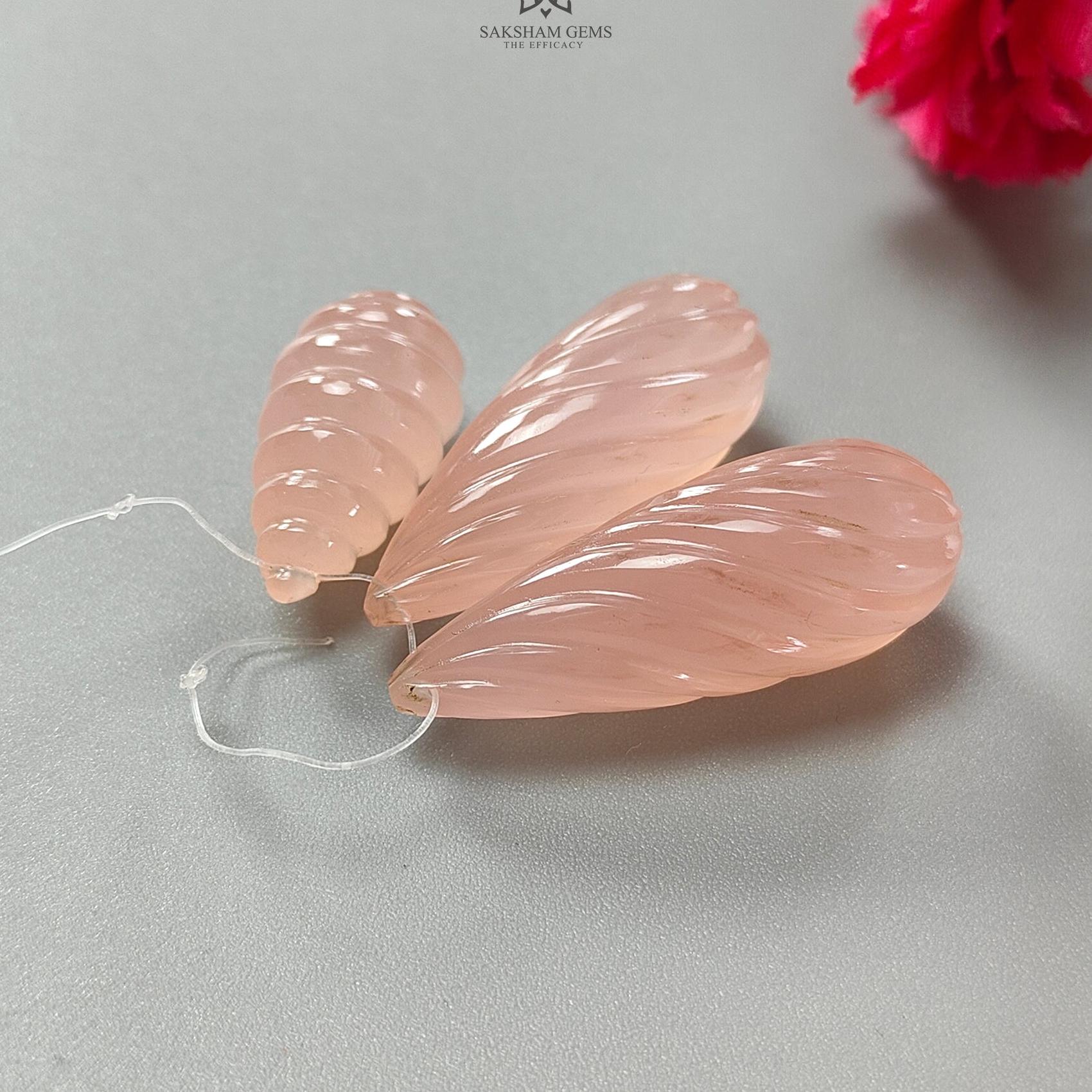 Peach Onyx Teardrops Carving: 68.70cts Natural Onyx Gemstone Hand Carved Drilled Beads 21mm - 33mm 3pcs Set