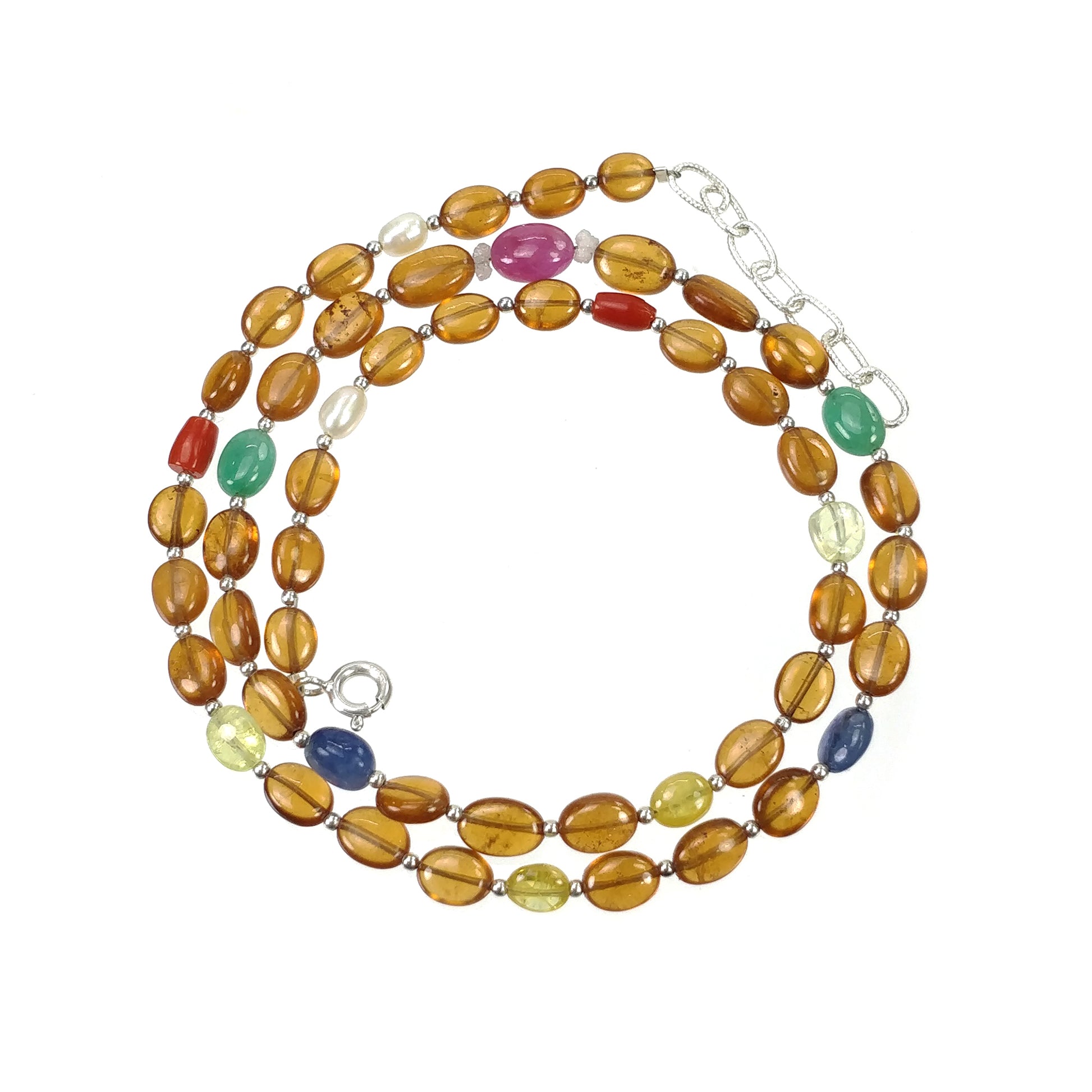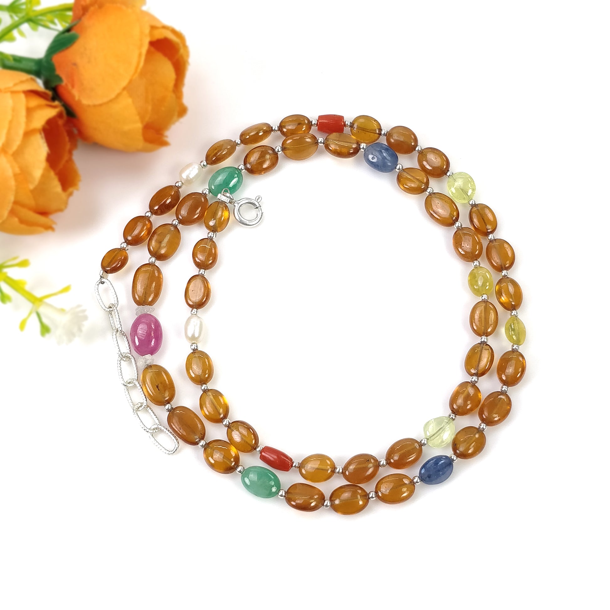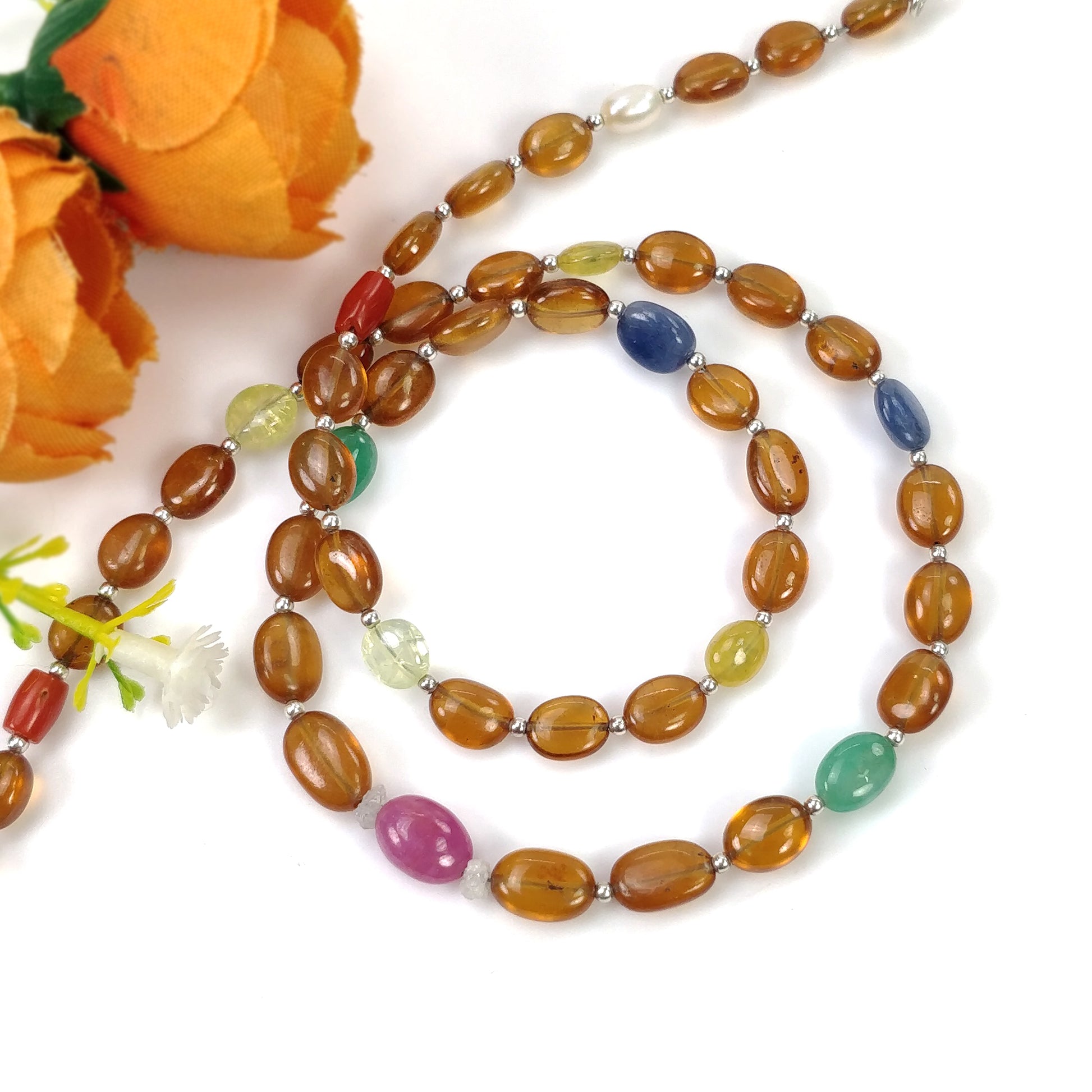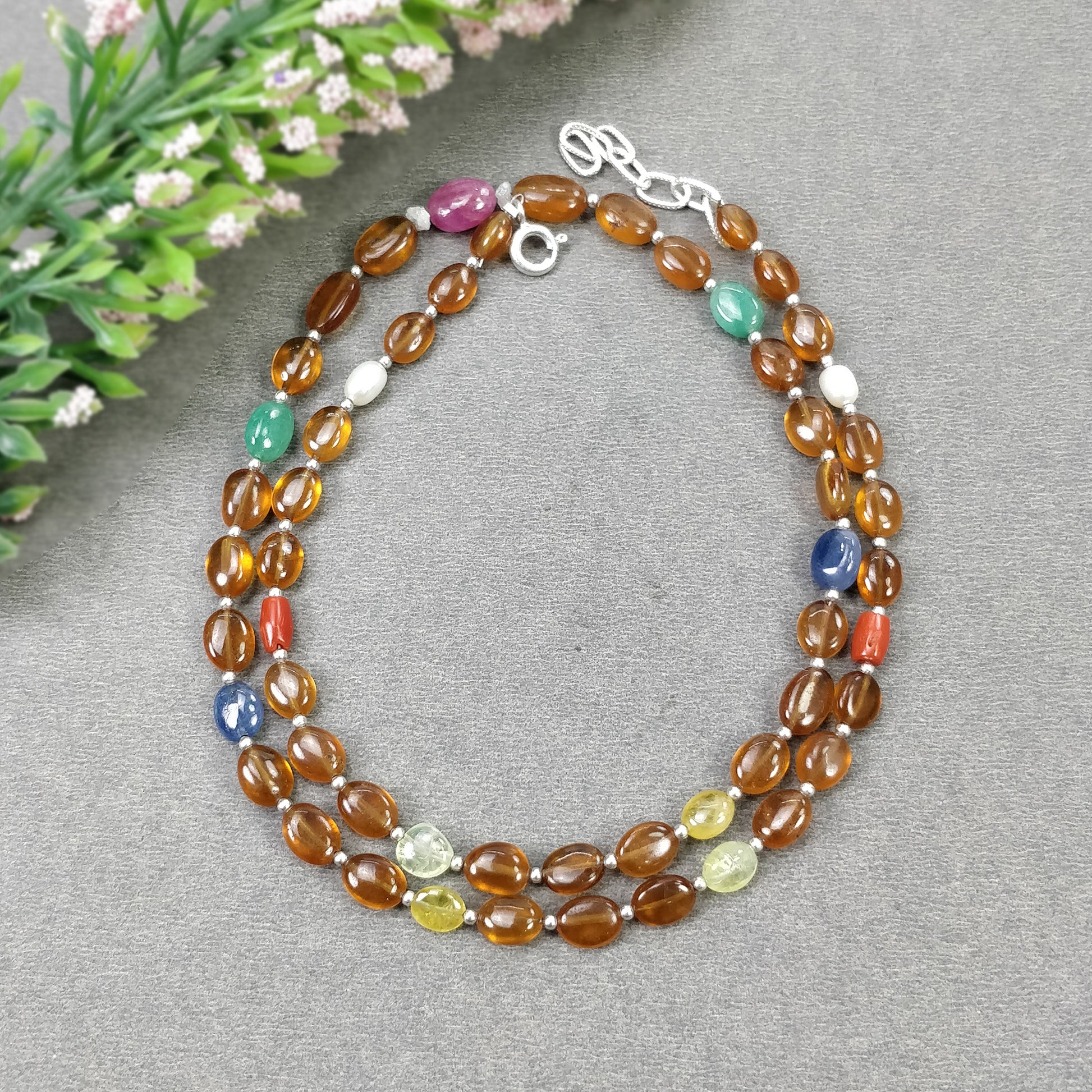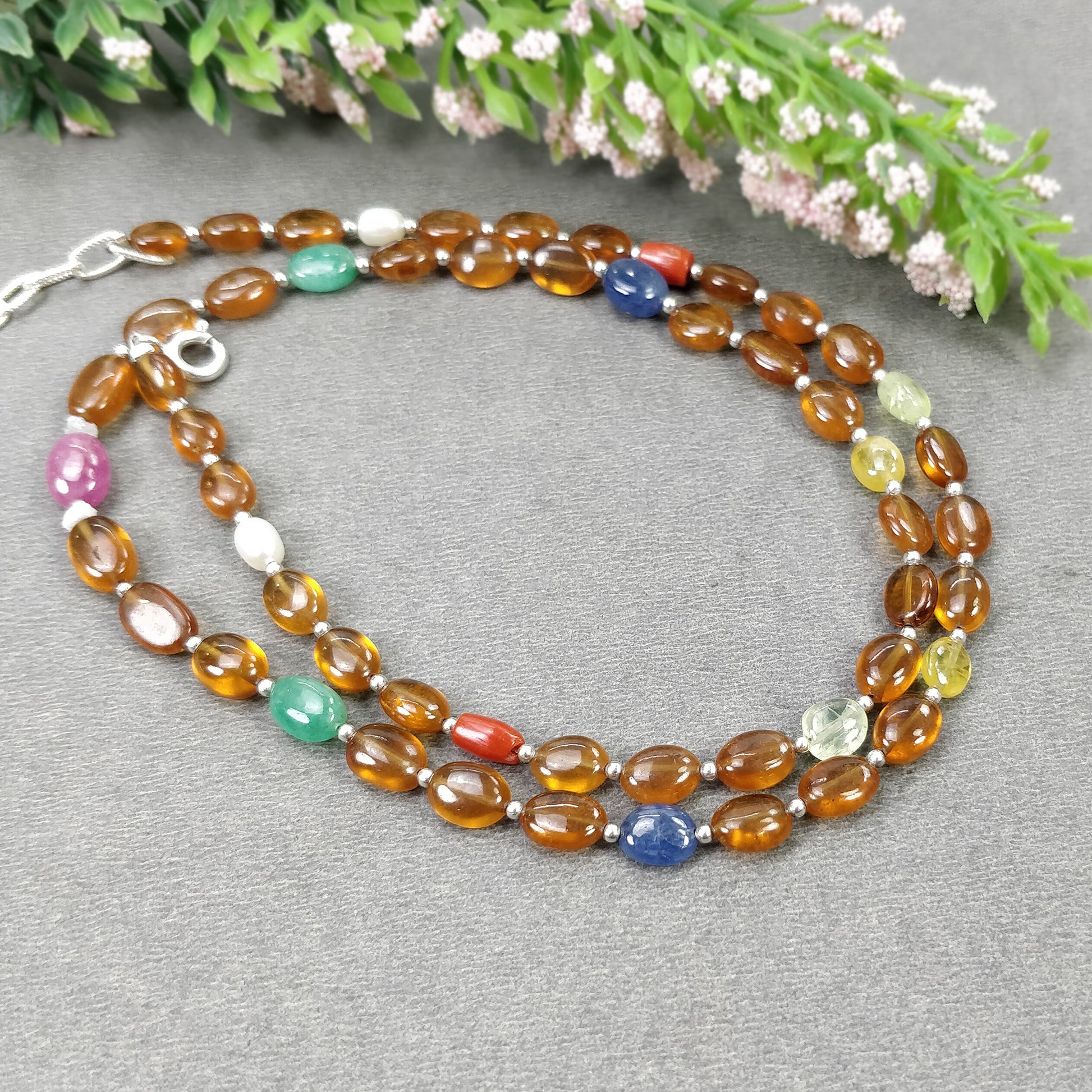 Hessonite Garnet Blue Yellow Sapphire Coral Diamond Emerald Cat's Eye Ruby Pearl Nav Ratan Necklace: 16.53gms Natural 9*7mm 18"