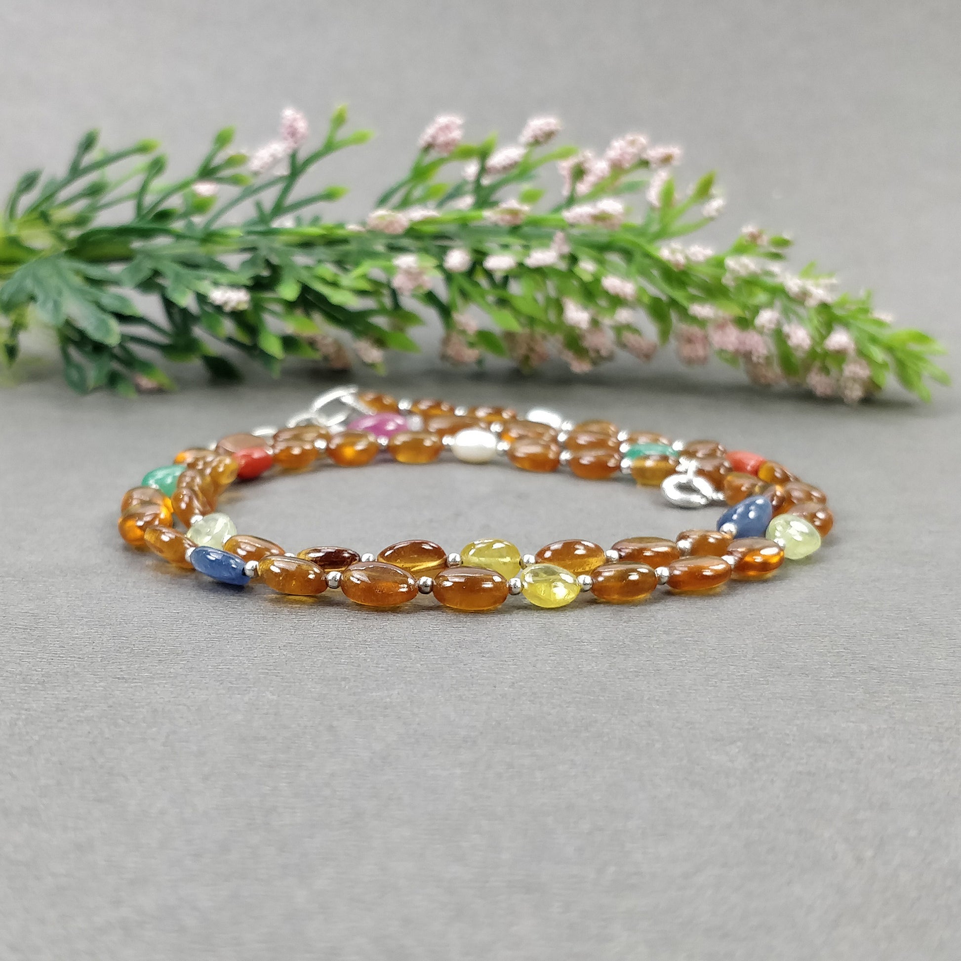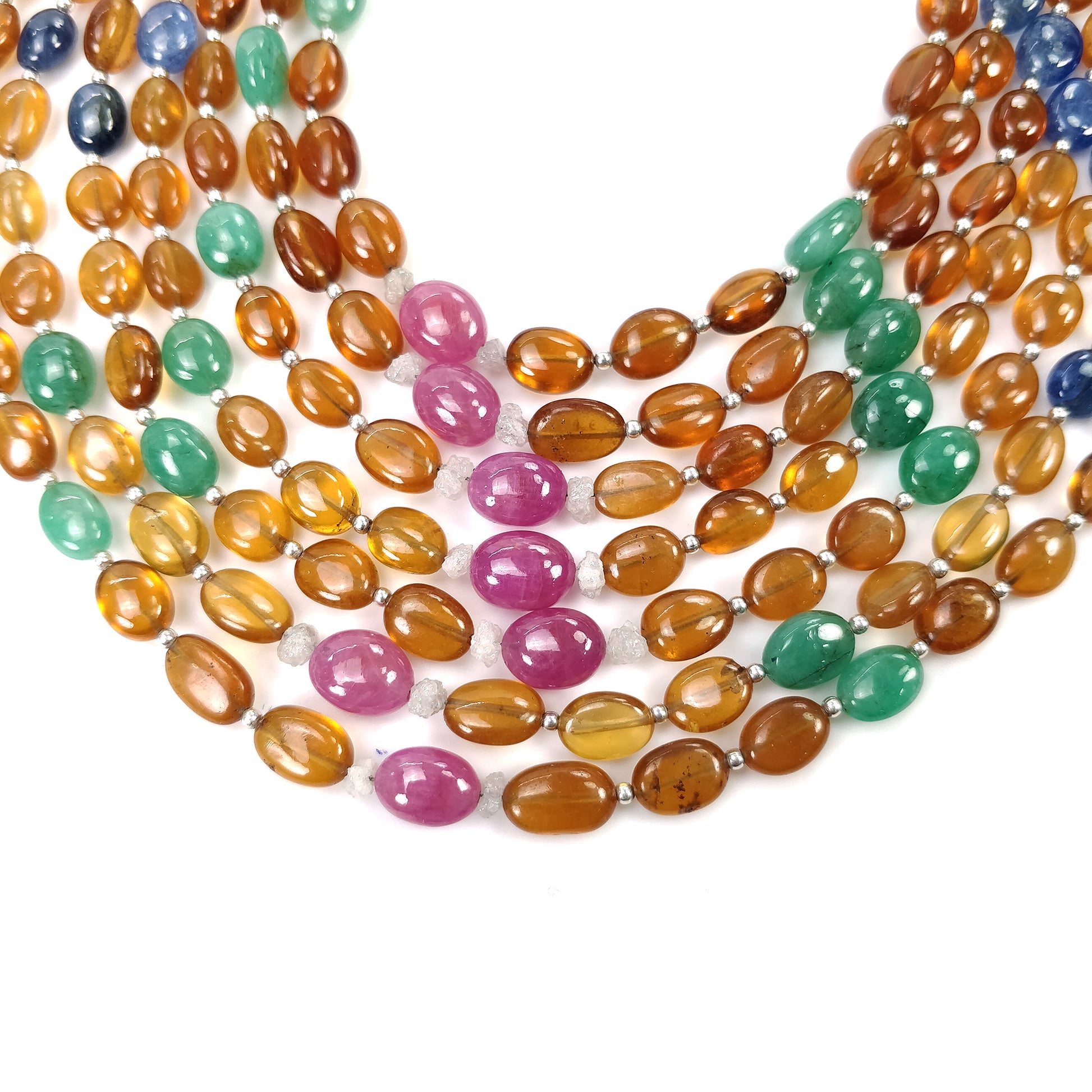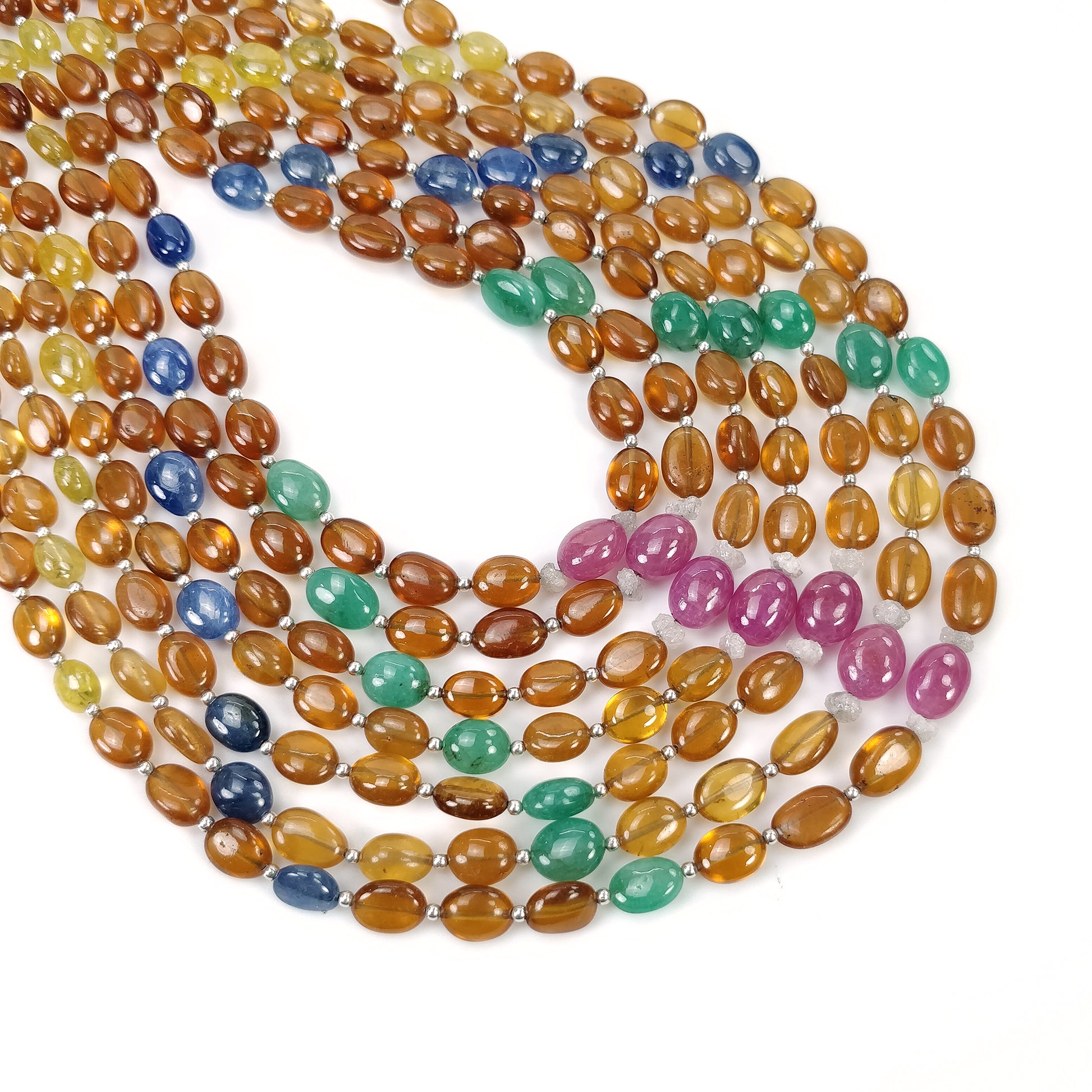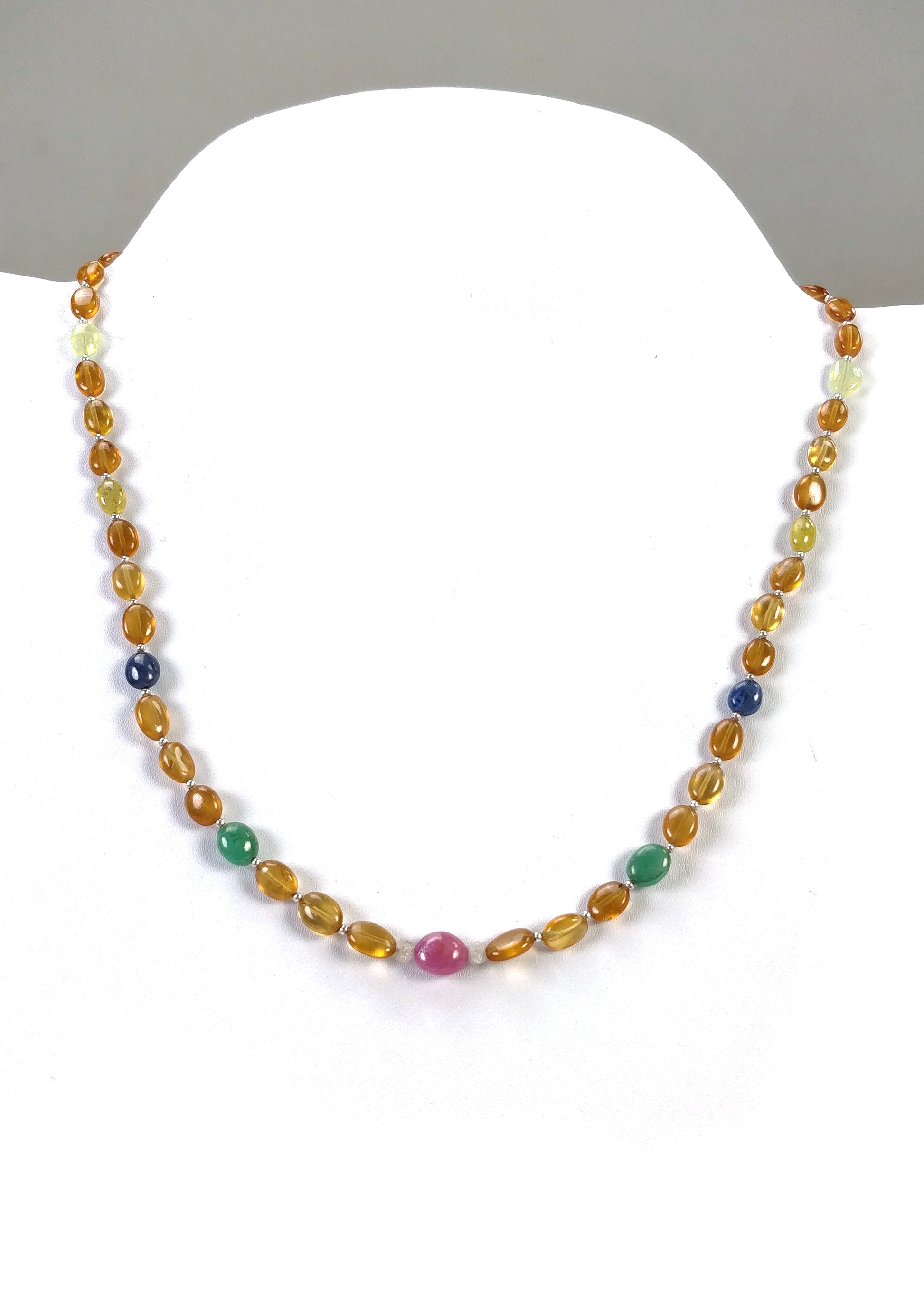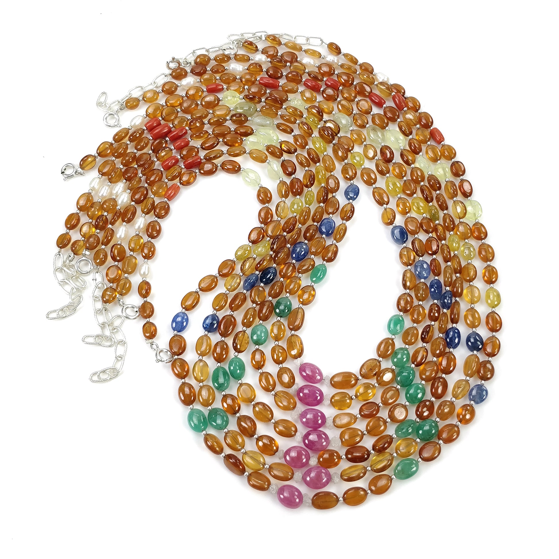 Hessonite Garnet Blue Yellow Sapphire Coral Diamond Emerald Cat's Eye Ruby Pearl Nav Ratan Necklace: 16.53gms Natural 9*7mm 18"