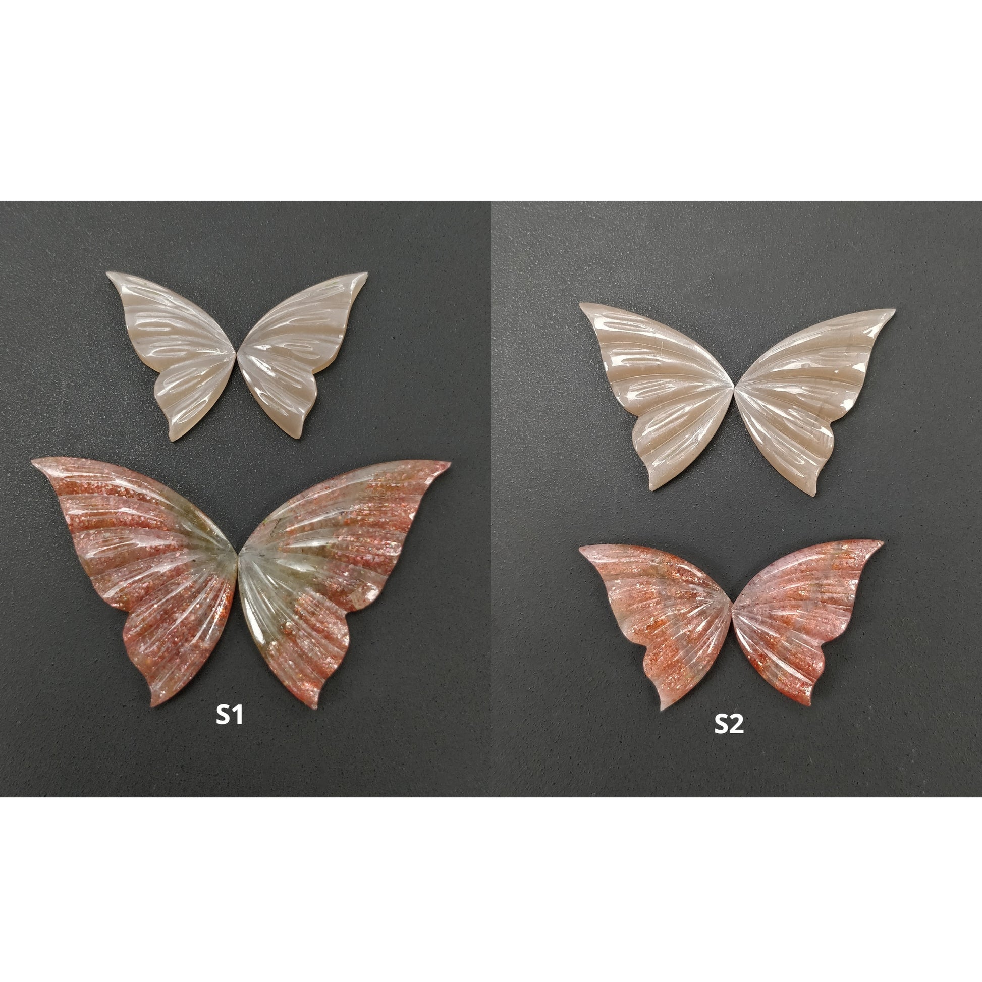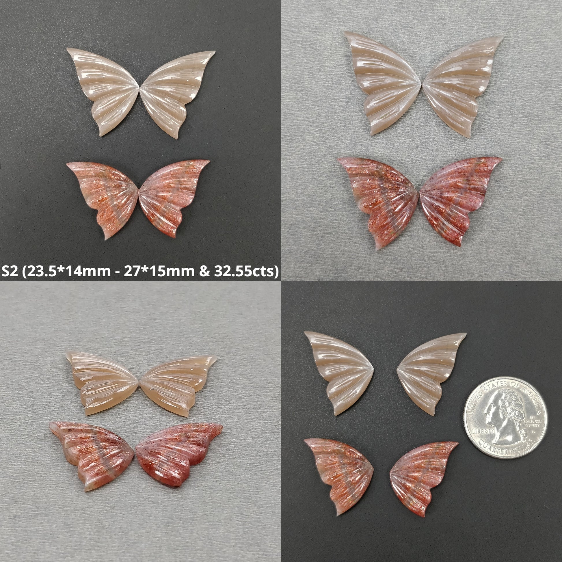 Orange Sunstone & Peach Moonstone Gemstone Carving : Natural Untreated Unheated Hand Carved Butterfly 2 Pair Set